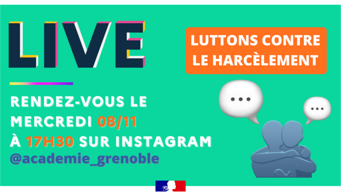 L’académie de Grenoble proposera le mercredi 8 novembre de 17h30 à 18h00 un live spécial Lutte contre le harcèlement.